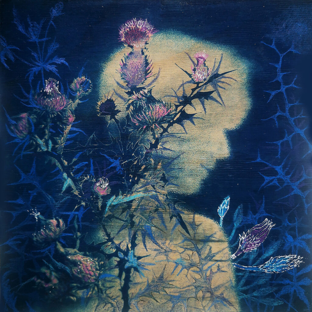 Xecon Uddin, Floating in a dream – 3, 2025, cyanotype and drawing – acrylic, pen and pencil on wood, 25 x 25 cm
