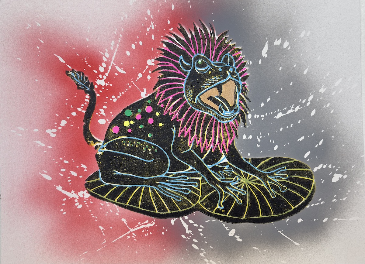 Thibault Laget-Ro, Bestiary, 2025, the pink grelion, linocut, 30 x 40 cm, single print