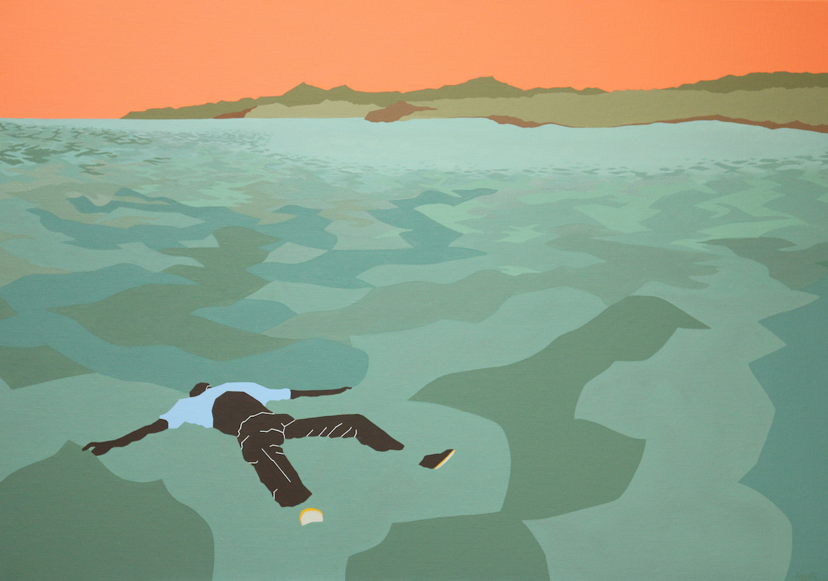 The sea clearly does not have the same meaning for everyone, depending on where they were born. This is what Thibault Laget-Ro’s multicoloured canvases seem to say, in a veiled way. For the suave tones he uses, their deceptive cheerfulness, contrast with the subject of the scenes inspired by great photographic reporters. The flat treatment, which banishes all roughness, further accentuates this discrepancy between form and background, style and motif. One does not know who is lying, the subject or the colour, and this paradox adds a note of irony.